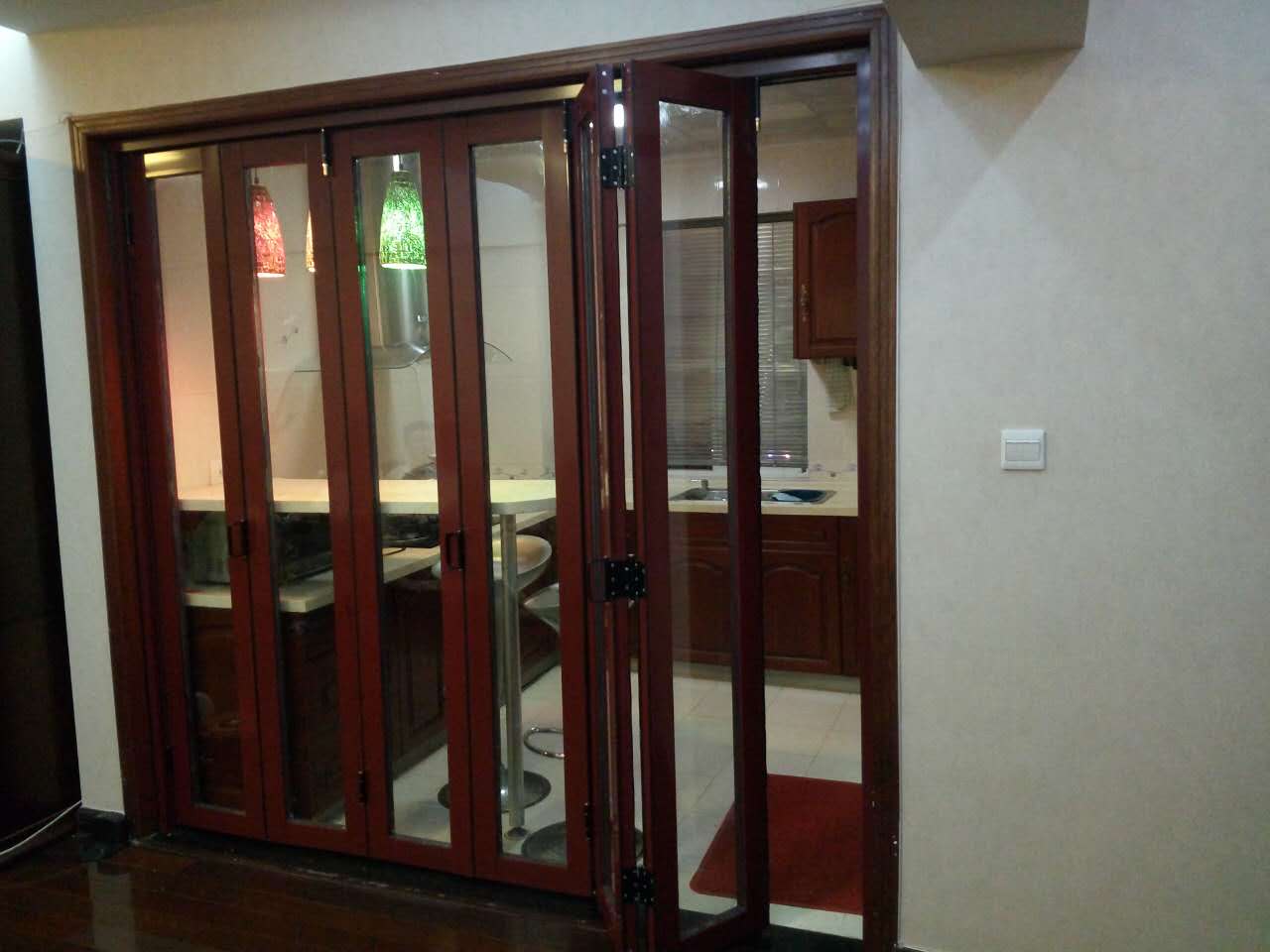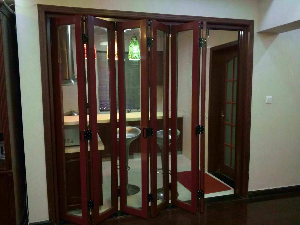 1、折疊門外觀時尚休閑,滑動開啟方便,防水和防潮,隔音效果好,耐磨耐用經(jīng)久不褪色,綠色環(huán)保,安裝方便,密封性好,實用性強,折疊無噪音,日久不會變形,大面積的玻璃設計,采光效果更佳。可做四折,左右各折一邊。也可做無數(shù)折全部折一邊,隨意怎么做怎么折都可以。